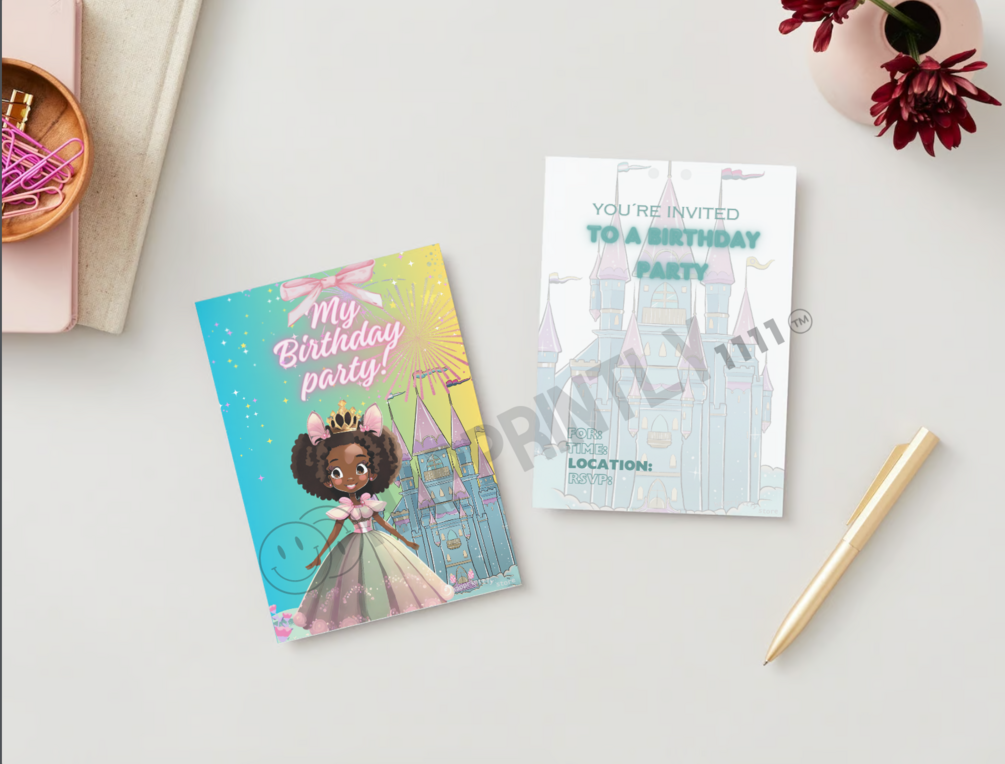 Invite your loved ones to a magical birthday celebration with our elegant, downloadable PDF card inspired by a charming princess world.